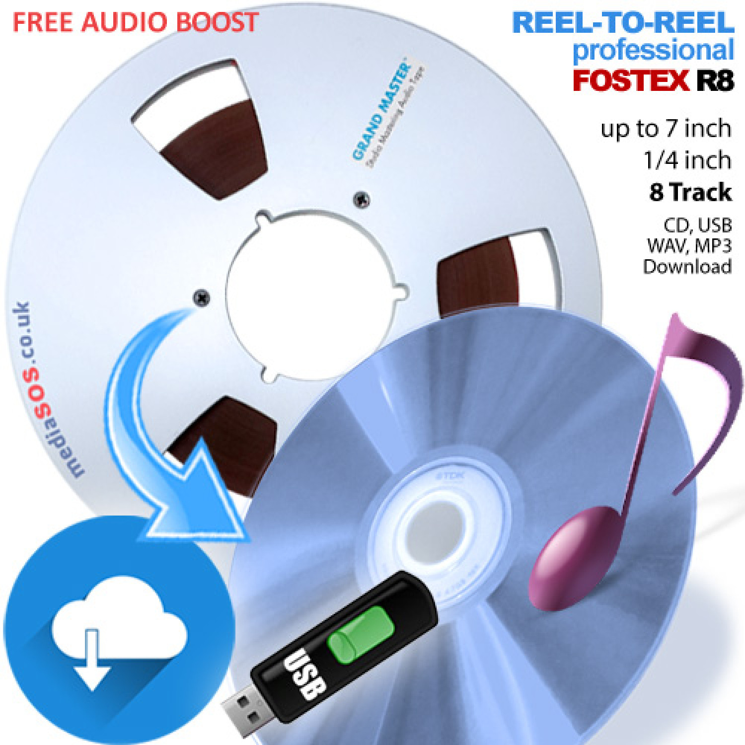 Media SOS offers professional tape transfer services such as Fostex 1/4" 8-Track Reel to digital CD, USB stick, MP3, WAV and downloadable digital format for domestic and